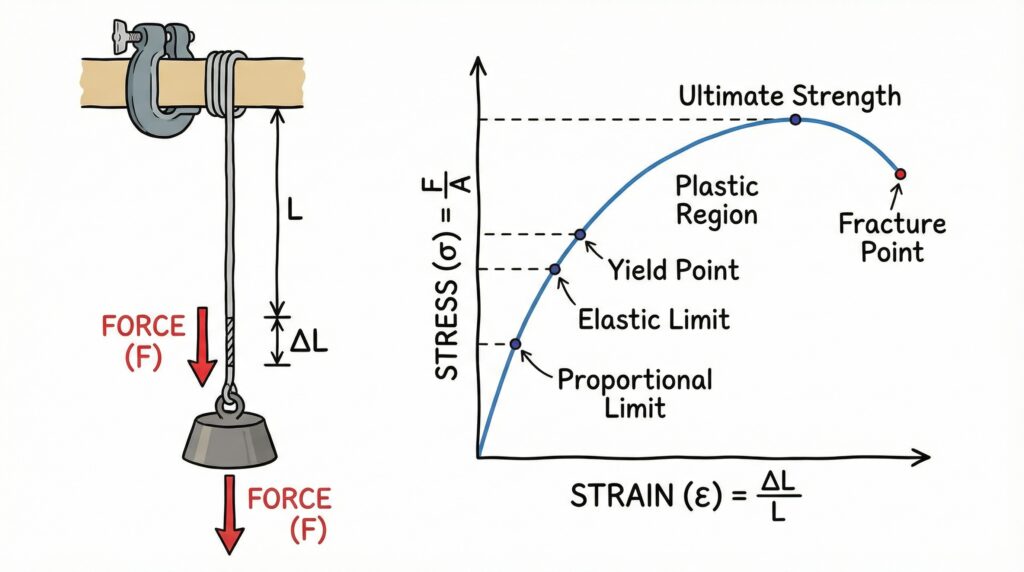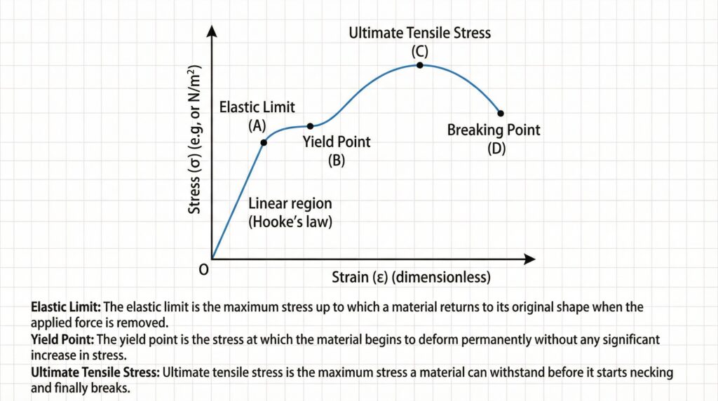 • Elastic Limit: The maximum stress up to which a material returns to its original shape when stress is removed