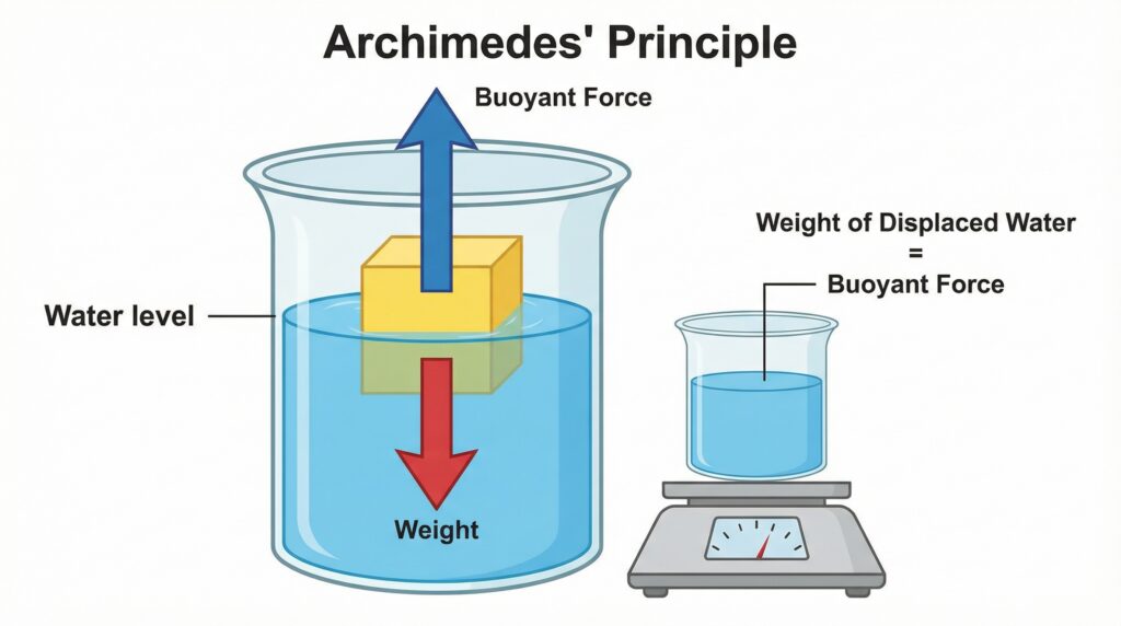 Answer: According to Archimedes’ principle, when an object is immersed in a fluid, it experiences an upward buoyant force equal to the weight of fluid displaced.